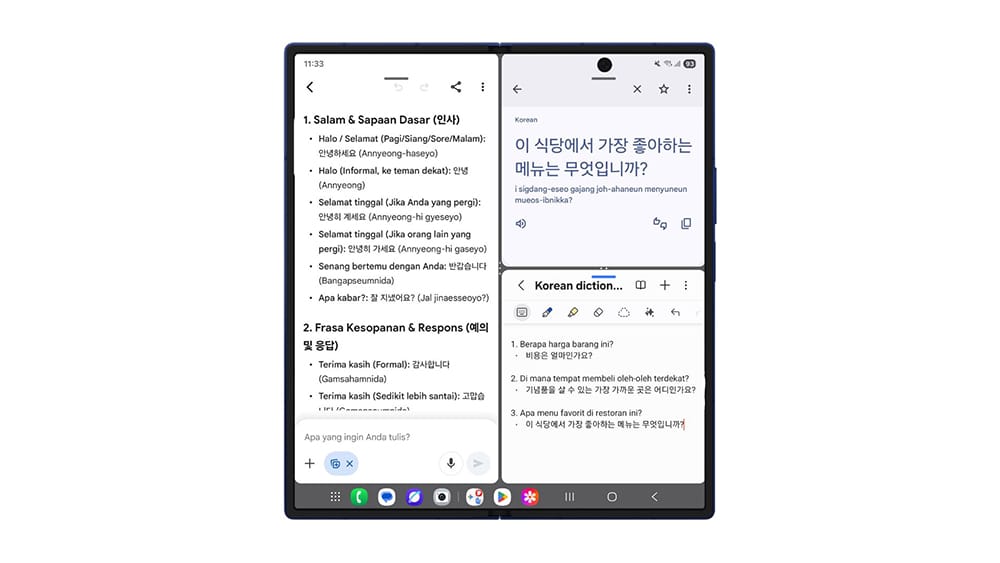 Selain produktivitas, Galaxy Z Fold7 juga memfasilitasi eksplorasi. Saat belajar bahasa asing, pengguna bisa membuka aplikasi pembelajaran di satu sisi, mencatat kosa kata baru di Samsung Notes di sisi lain, dan menerjemahkan kalimat di aplikasi ketiga. Semua bisa dilakukan bersamaan tanpa kehilangan fokus. Layar besar memungkinkan pengalaman belajar dan bekerja yang fungsional, bukan sekadar menampilkan banyak aplikasi di layar.