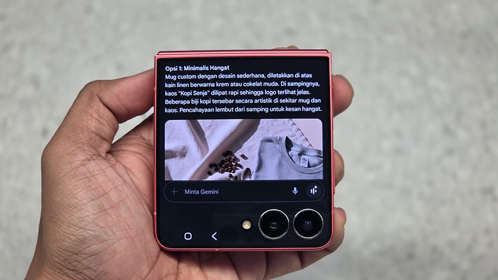 Galaxy Z Flip7 dengan Gemini AI hadirkan solusi konten promosi instan. Bikin foto produk dan caption iklan kini lebih efisien dan hemat.
