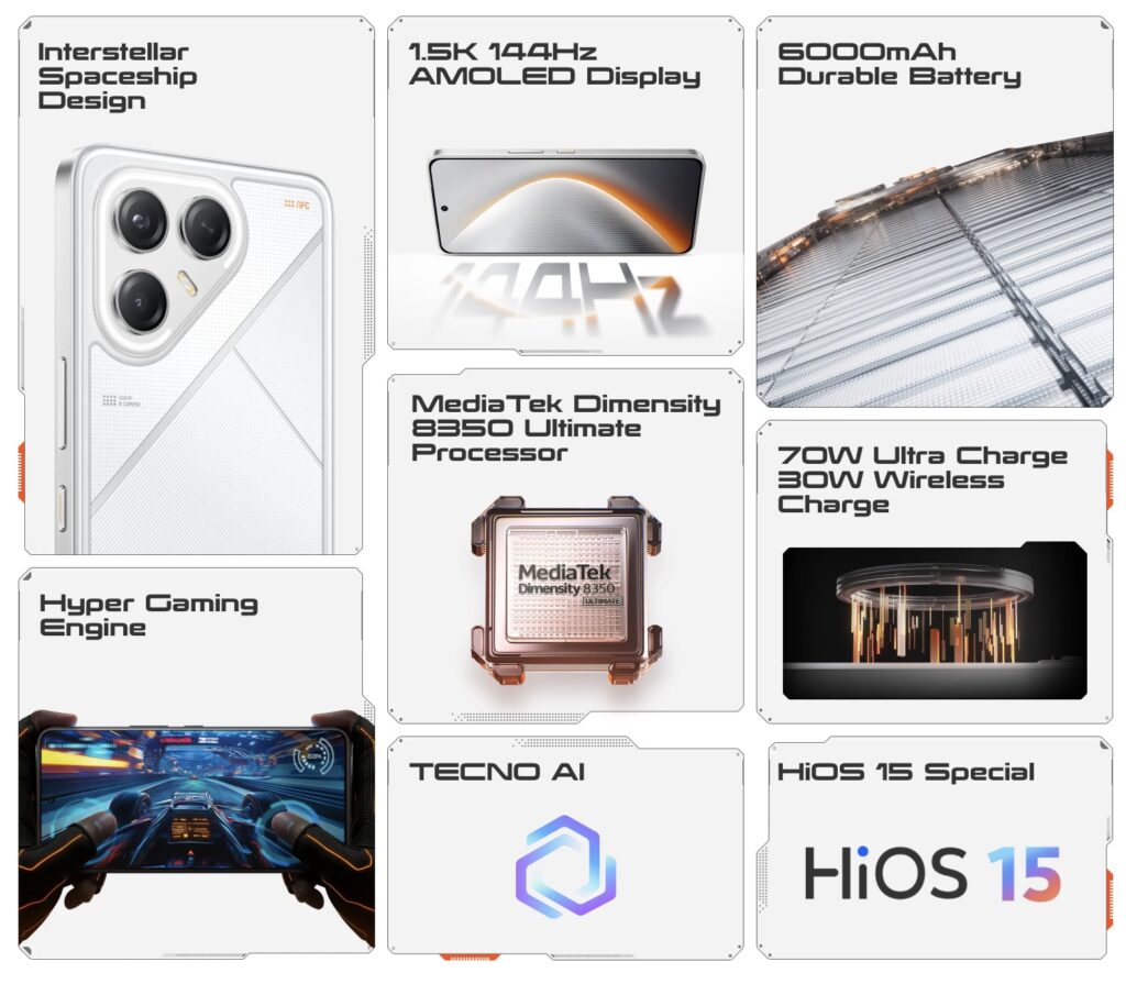 - Antarmuka Segar HiOS 15: Sistem operasi Android 15 dengan fitur Tecno AI canggih.