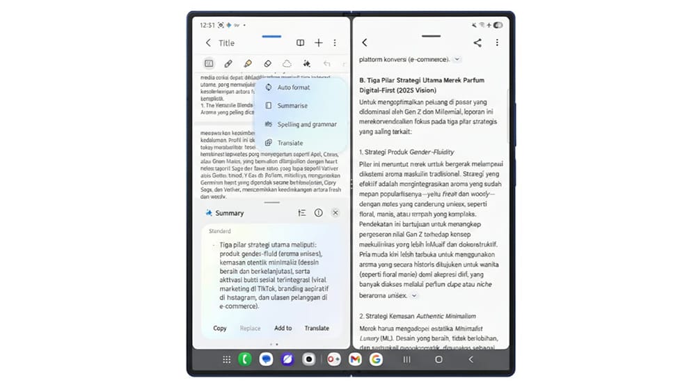 Keunggulan Galaxy Z Fold7 berlanjut pada tahap pengolahan data. Hasil riset dari Gemini dapat langsung dipindahkan ke aplikasi Samsung Notes tanpa berpindah perangkat. Di sinilah fitur Note Assist dari Galaxy AI bekerja.