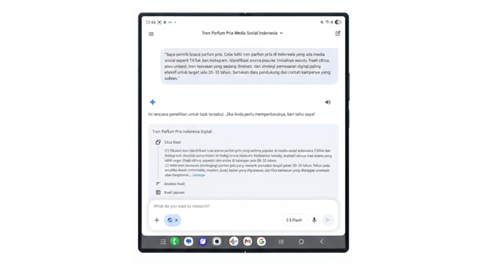 Sebagai gambaran konkret kecanggihan fitur ini, Samsung mencontohkan skenario seorang pemilik jenama parfum yang ingin meluncurkan produk baru untuk pria usia 20–35 tahun. Alih-alih melakukan riset manual, pengguna cukup memberikan perintah (prompt) spesifik kepada Gemini Deep Research di Galaxy Z Fold7.